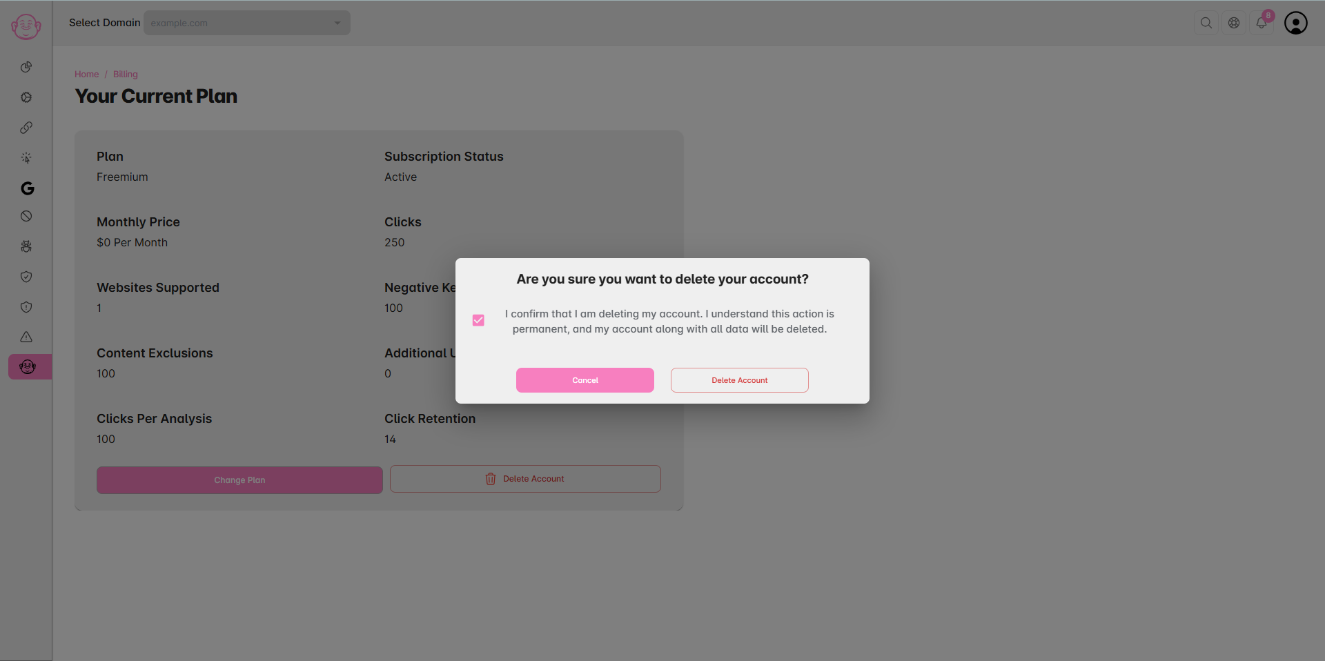 All domains, blocked IPs, Click Zen analysis, and historical data will be permanently deleted.