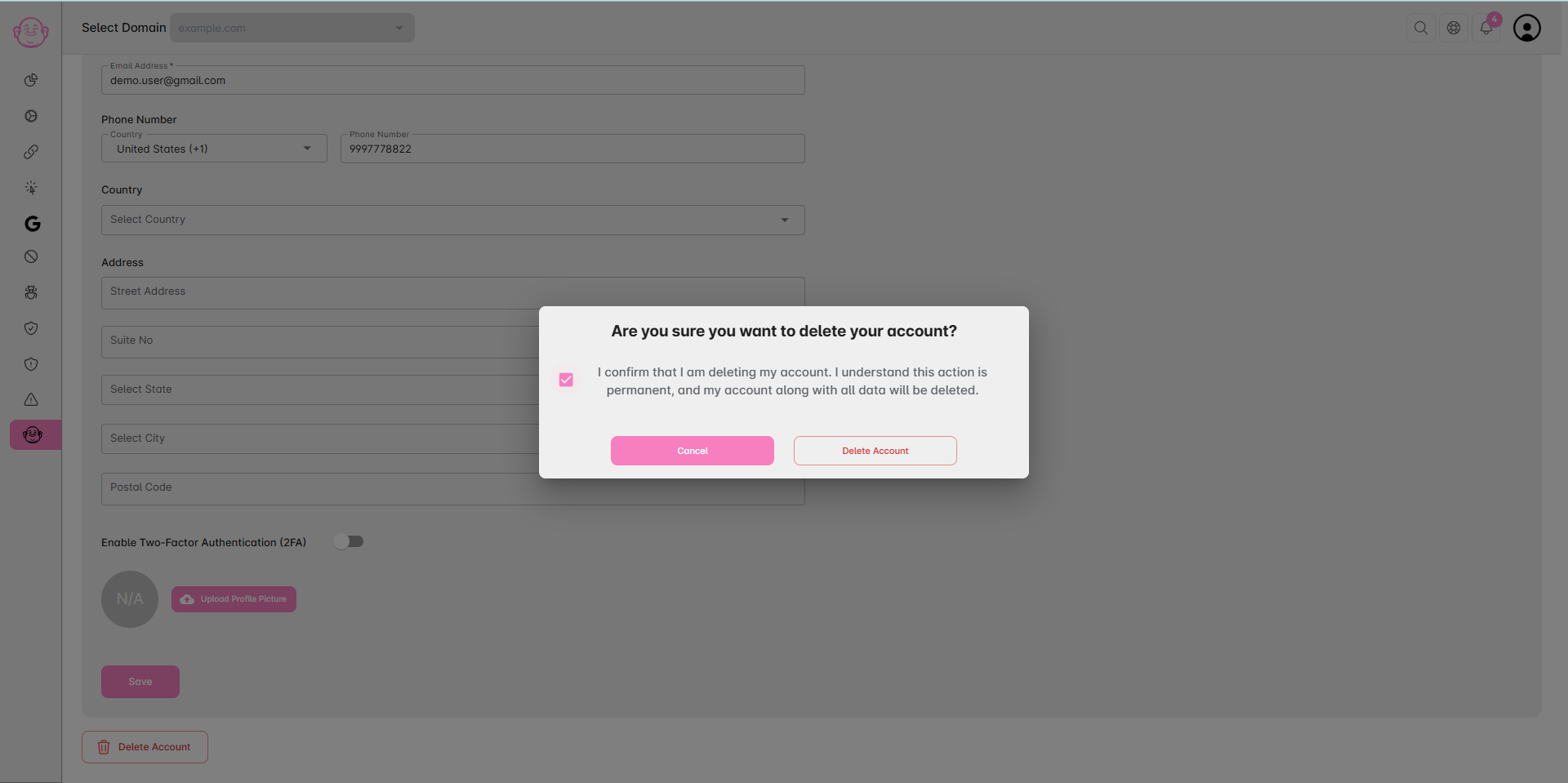 Confirm your choice to delete the account. Once confirmed, your account and all data will be permanently removed.