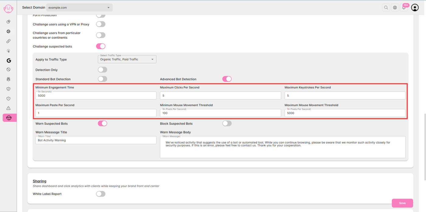 This helps you balance between accurate detection and minimizing false positives (real users flagged as bots).