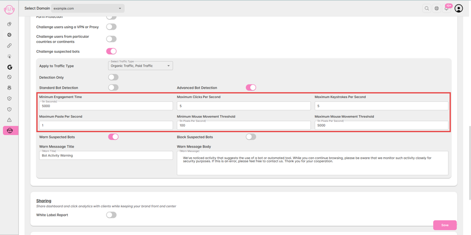 Click Buddha allows you to fine-tune the Bot Sensitivity Level — controlling how aggressively the system detects and blocks automated traffic.