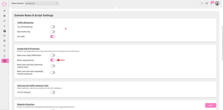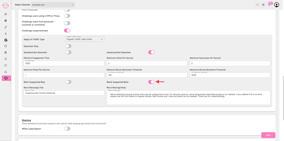 Enable the toggle "Block Suspected Bots". (It will block the bot when detected and show a Popup with a form for unblock request to the visitor.)