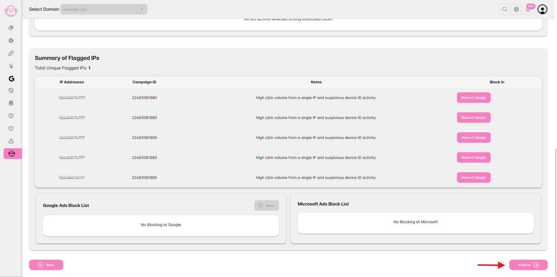 Once you blocked, the subnet IPs are automatically pushed to your connected Google Ads account to stop future fraudulent clicks.