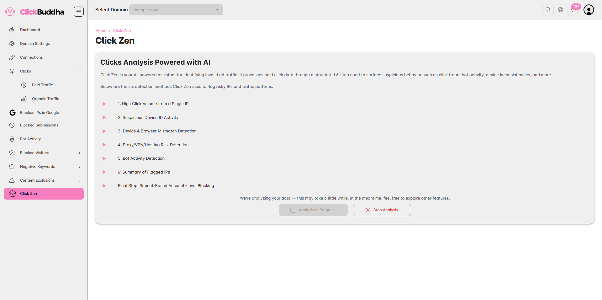 The system will process your data using Click Buddha’s 6-step AI validation model.