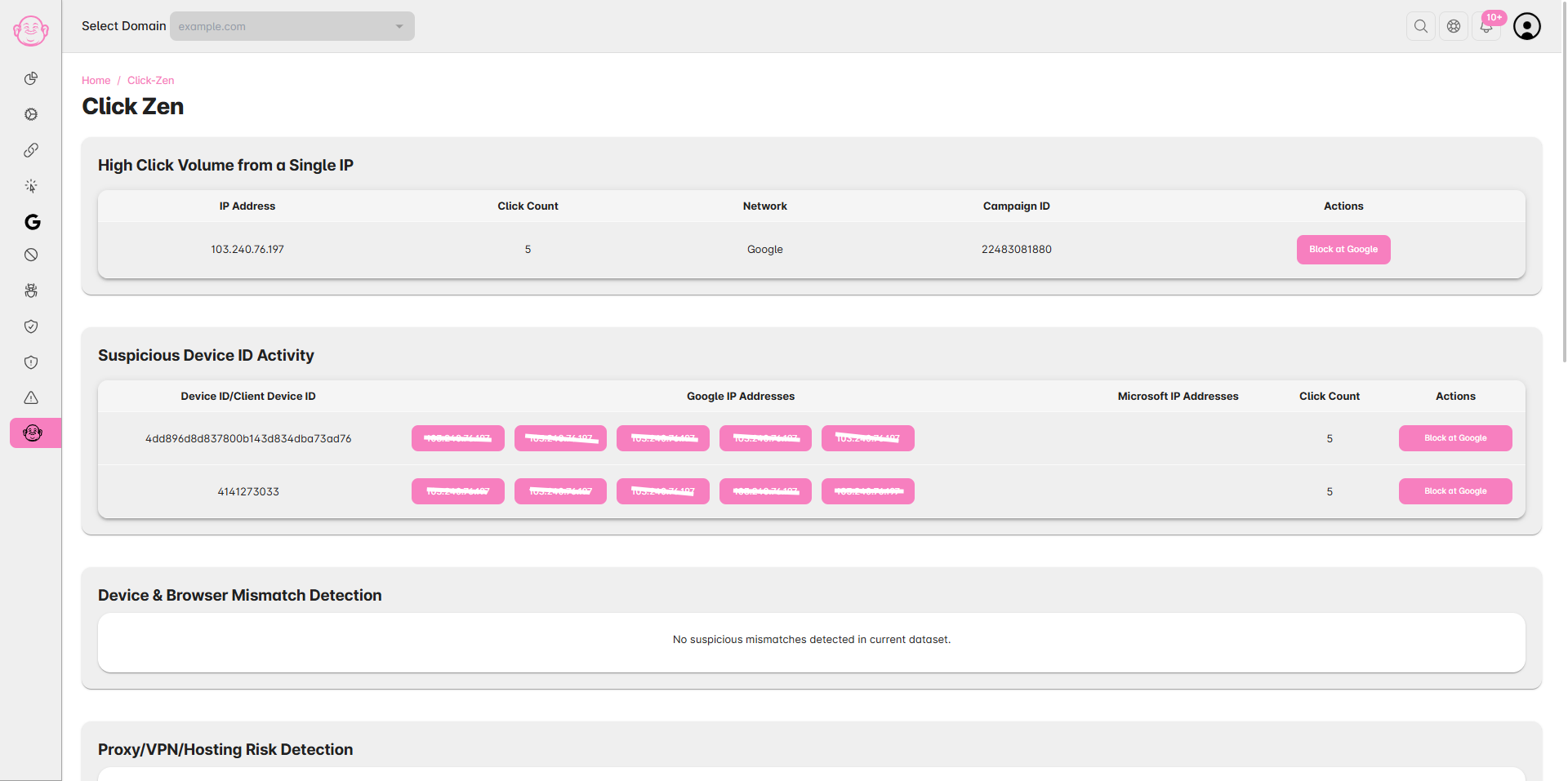 Open the Click Zen report to see AI recommendations for risky IPs, traffic patterns, and sources.