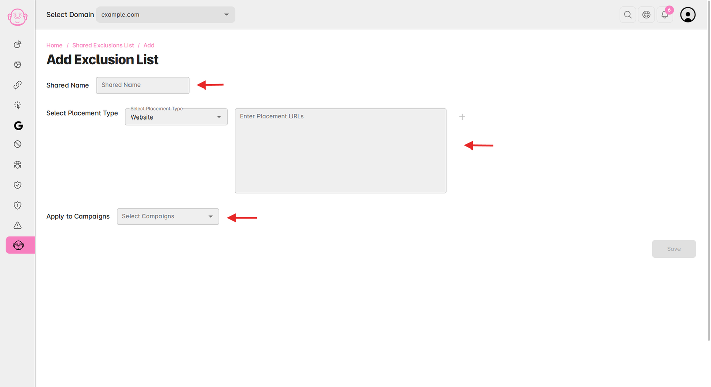 Add the URLs or placement domains you want to exclude or target.