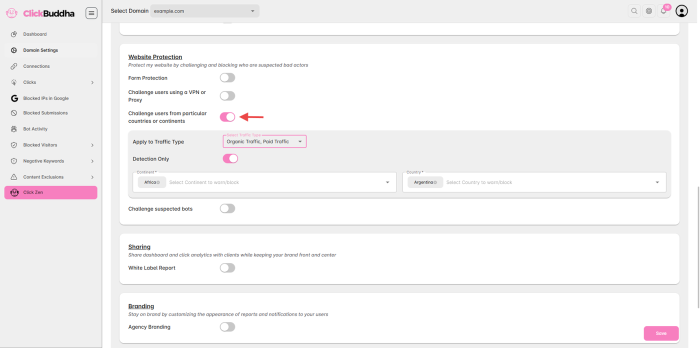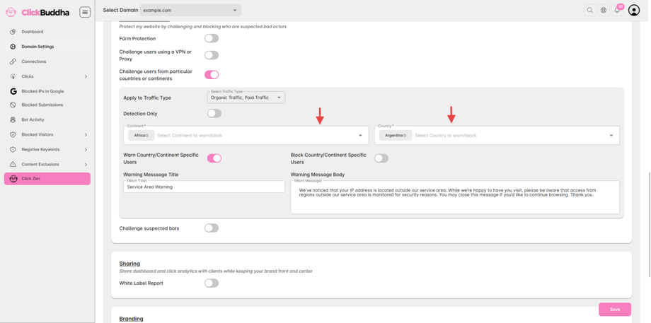 Click Buddha allows you to block unwanted traffic from specific countries or continents to protect your ads, forms, and website from irrelevant or fraudulent visitors.
