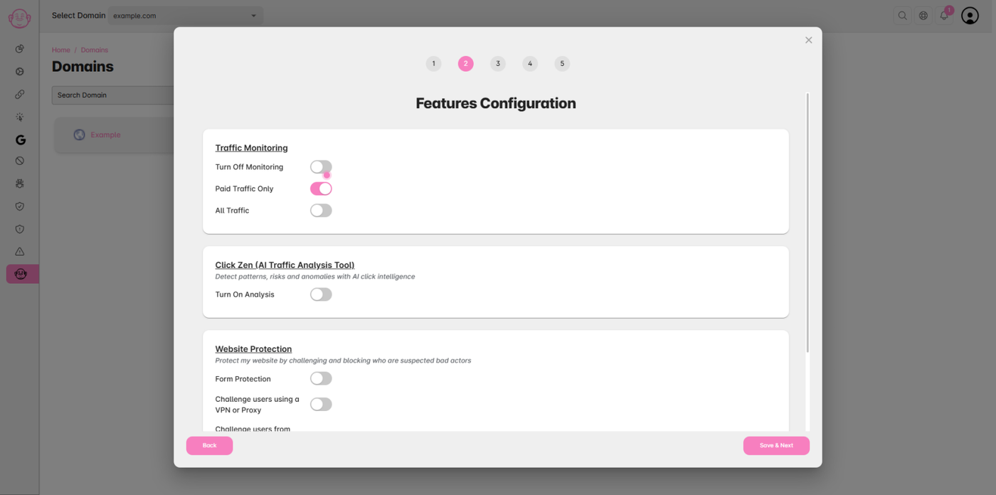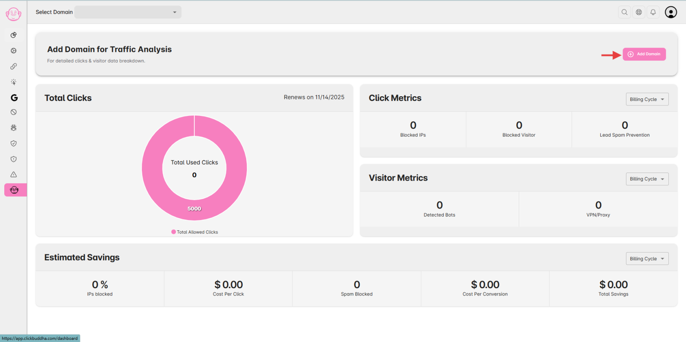 You can easily add and configure new domains inside Click Buddha to start tracking visitors, blocking bots, and managing protection settings.