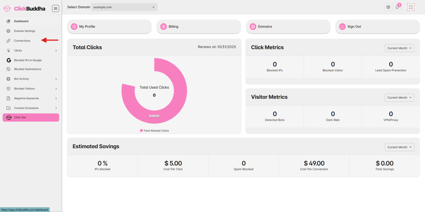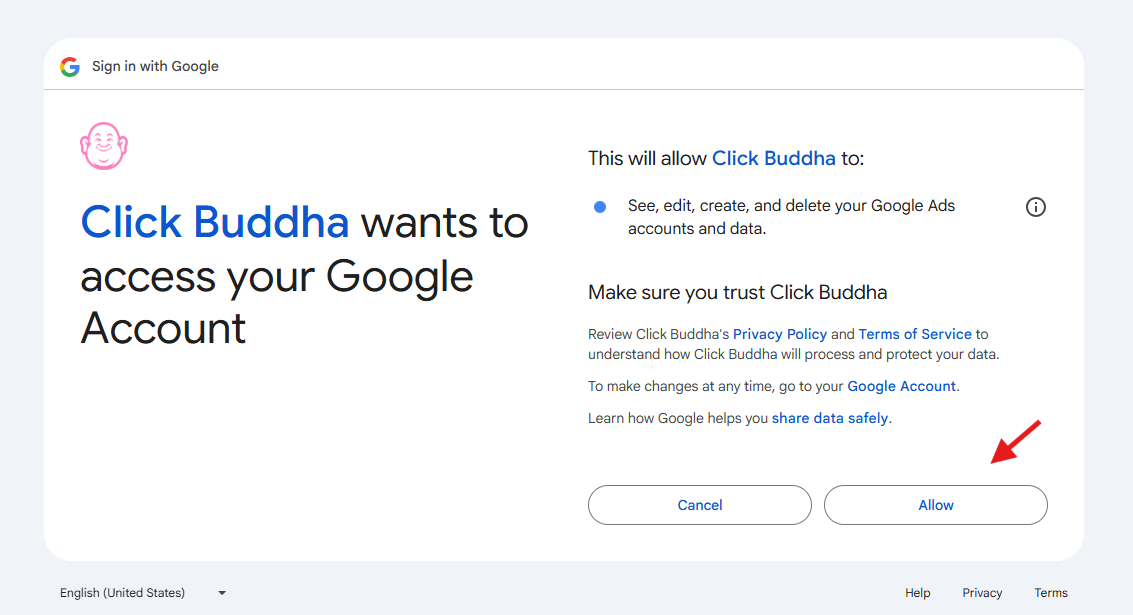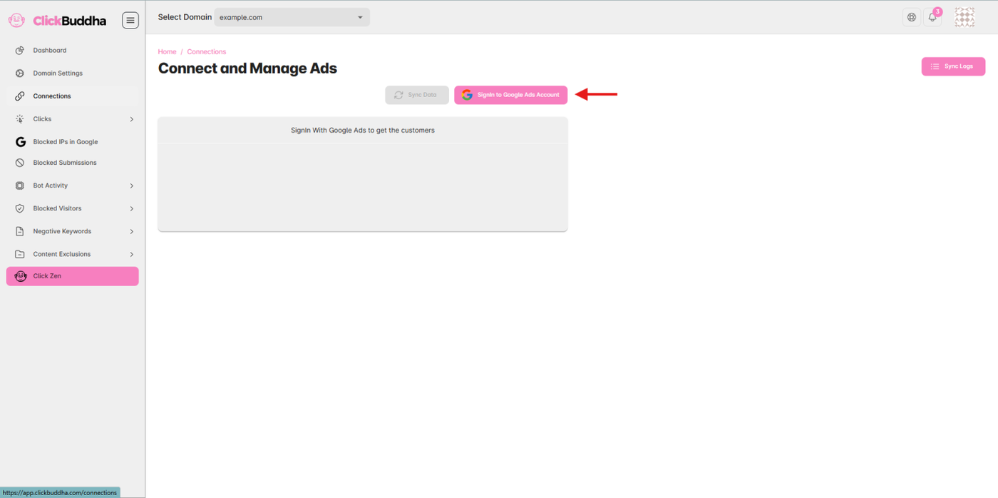 Connecting your Google Ads account allows Click Buddha to analyze your traffic, detect fraudulent clicks, and automatically block bad actors from wasting your ad budget.