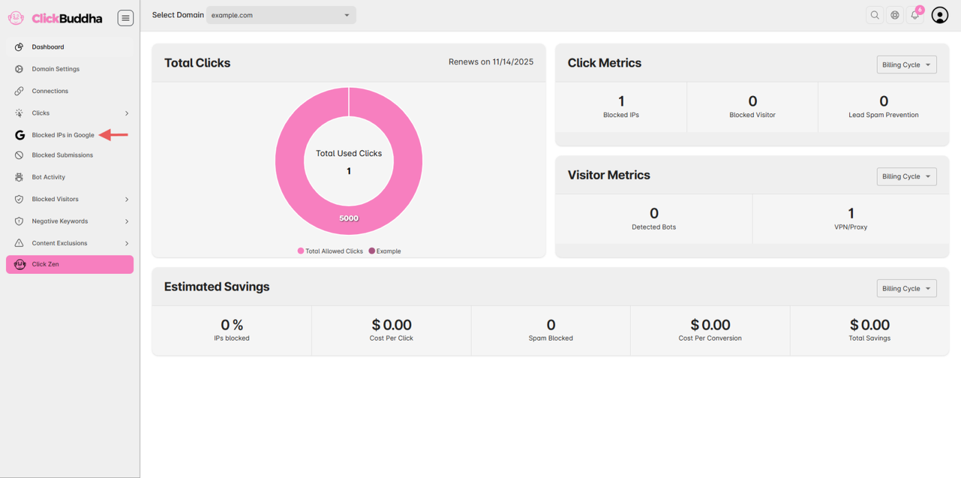 Click Buddha automatically blocks suspicious or fraudulent IPs in your Google Ads account when protection is enabled.