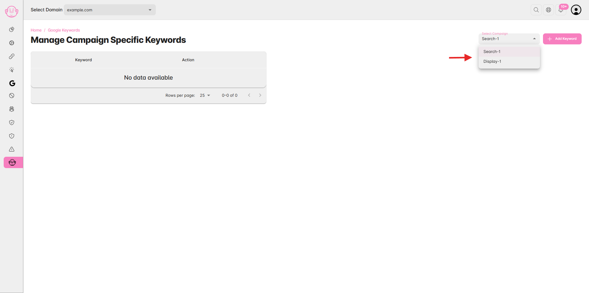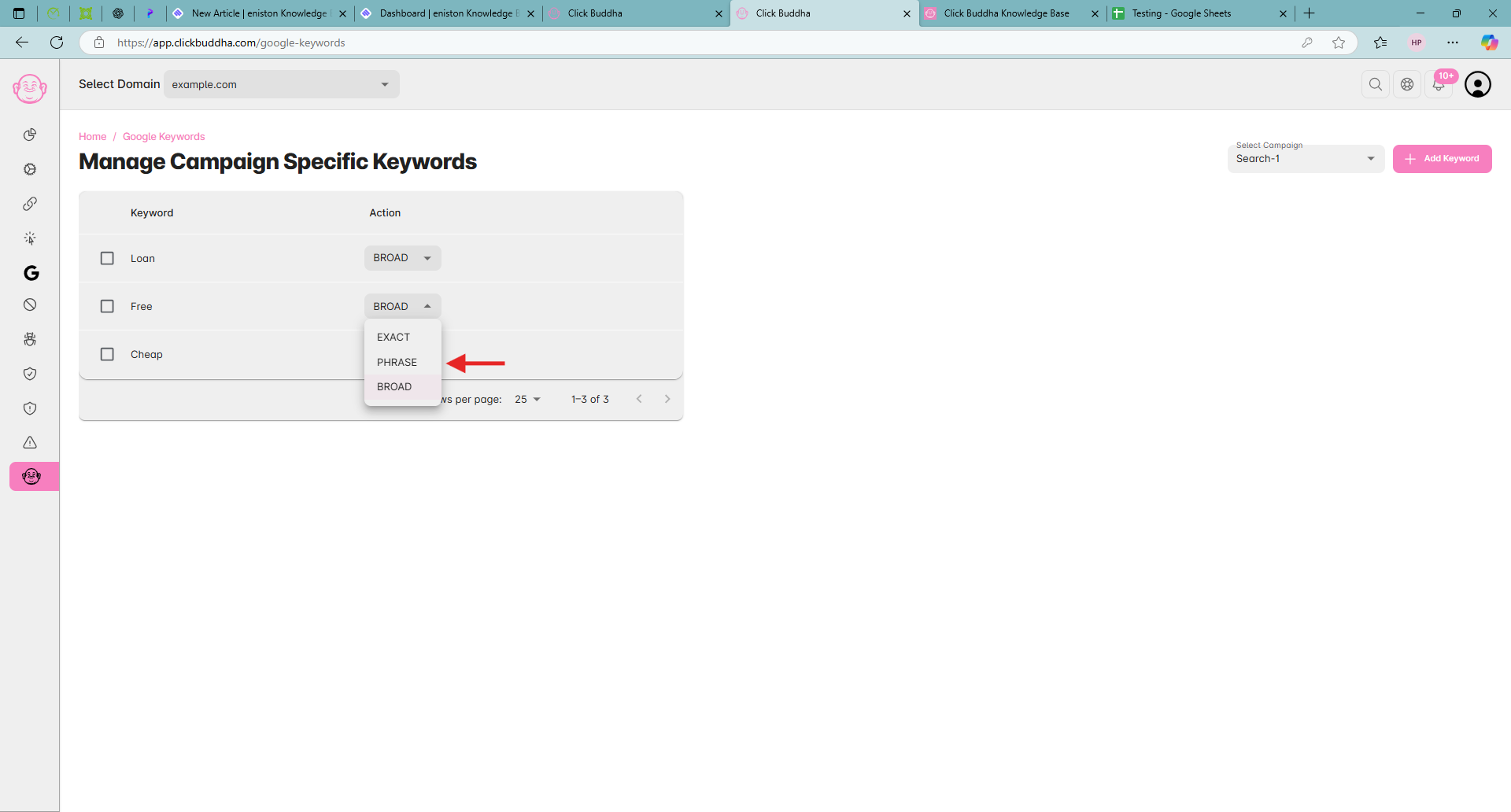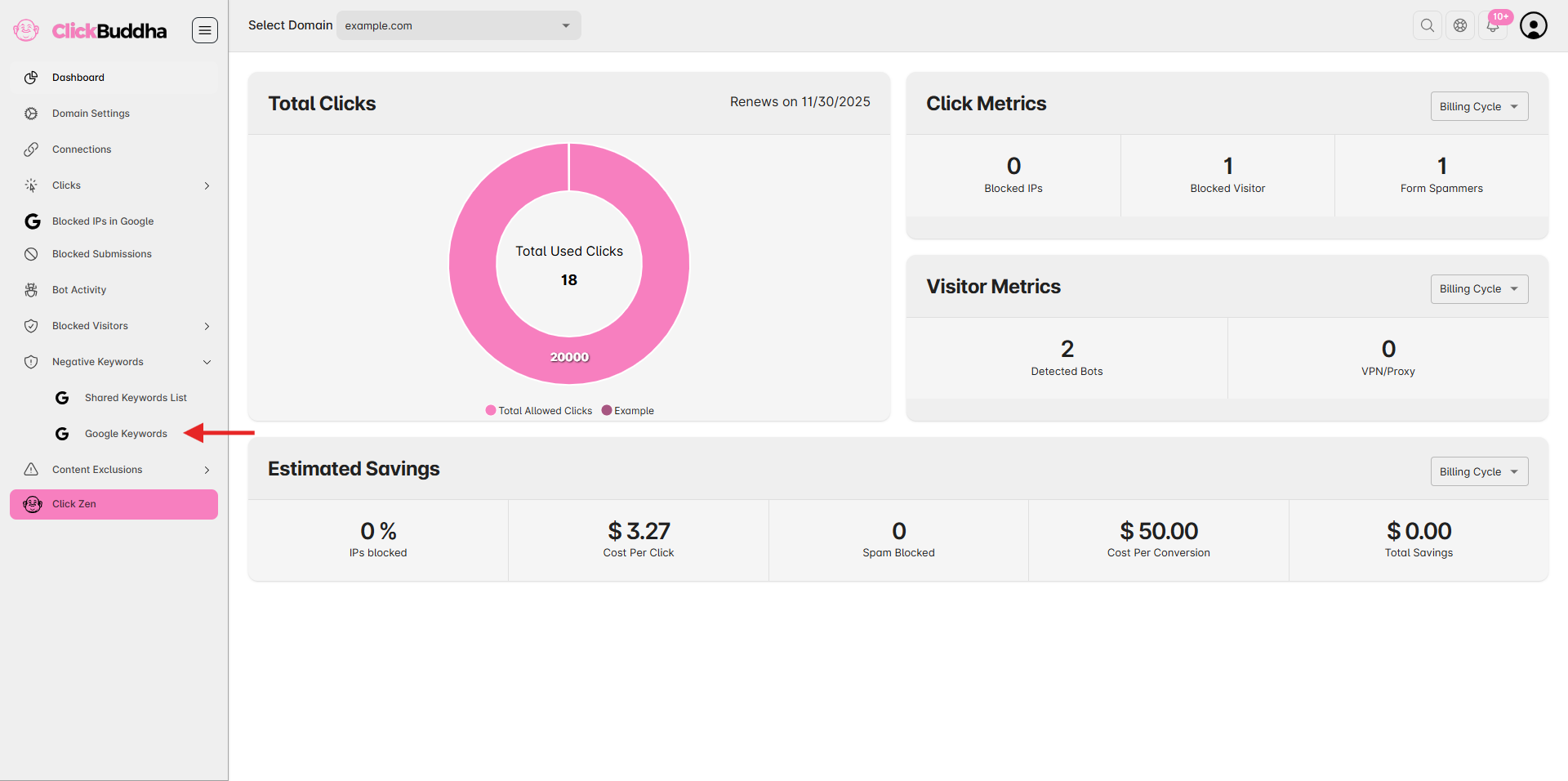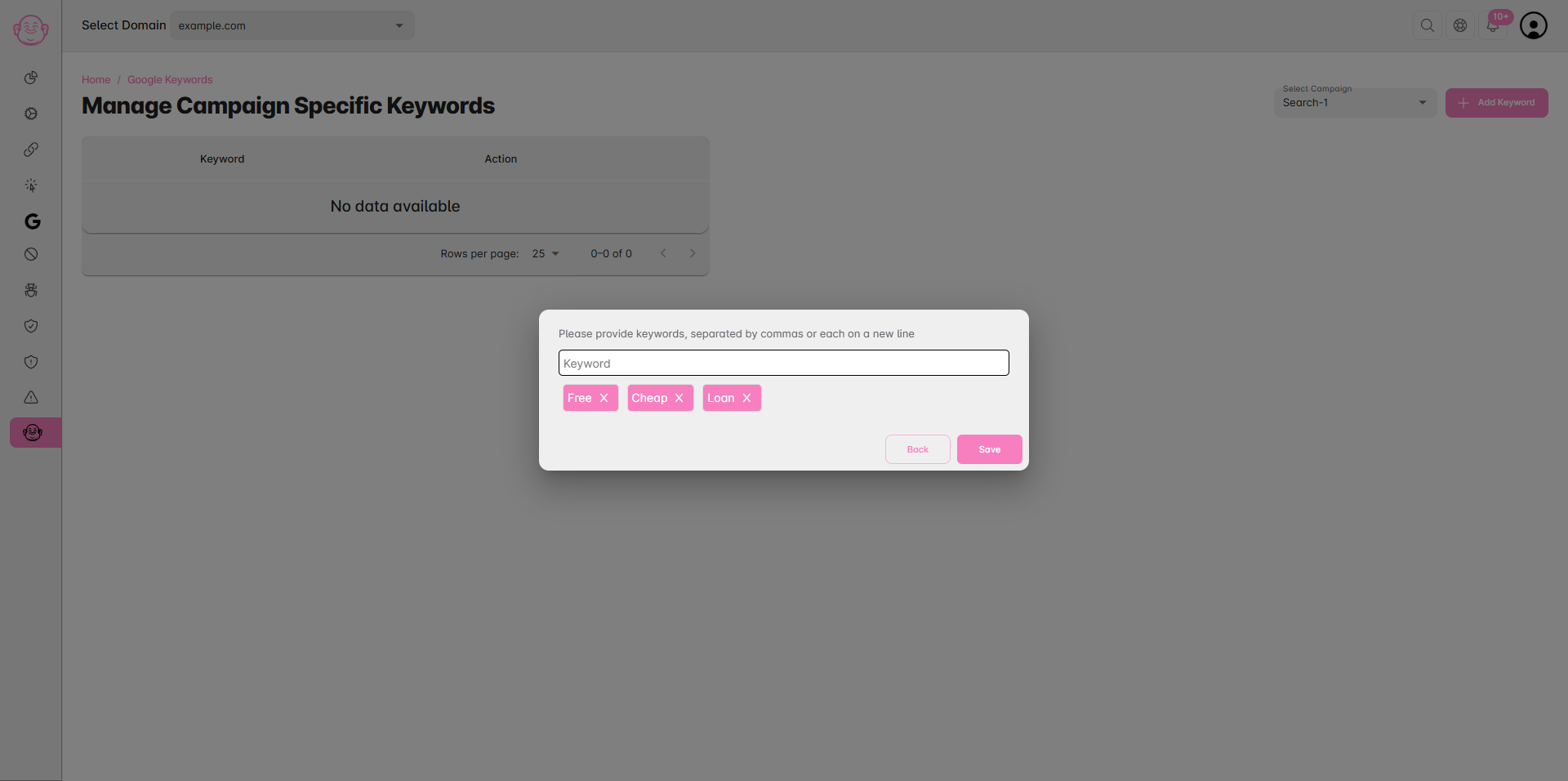 If you want to apply negative keywords to only one specific campaign instead of using a shared list, Click Buddha allows you to do that quickly within the Google Ads integration section.