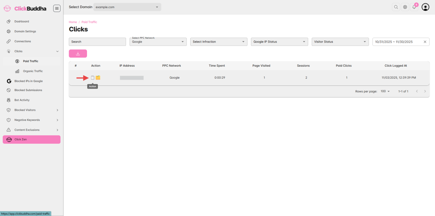 In the clicks table, look for the 🗒️ (Details) icon in the Action column.