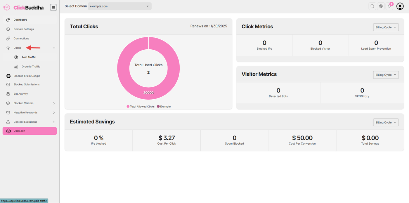 From the sidebar, select either Paid Clicks or Organic Clicks depending on the traffic type you want to review.