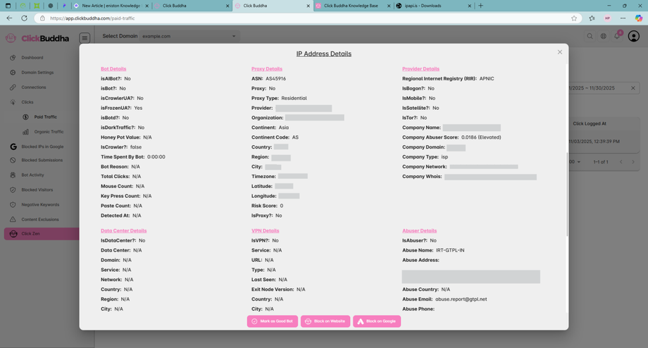 This detailed view helps you verify whether a visitor was flagged due to VPN/Proxy usage or datacenter routing, improving transparency in your traffic analysis. Also, the details are masked and sample data shown in the images.