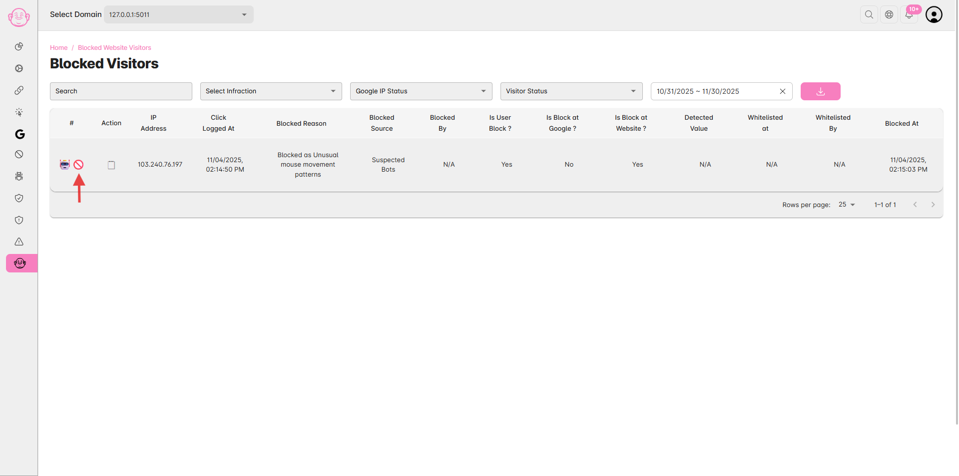 In the page, view the list of IPs marked with Icon (🚫) is blocked on website.